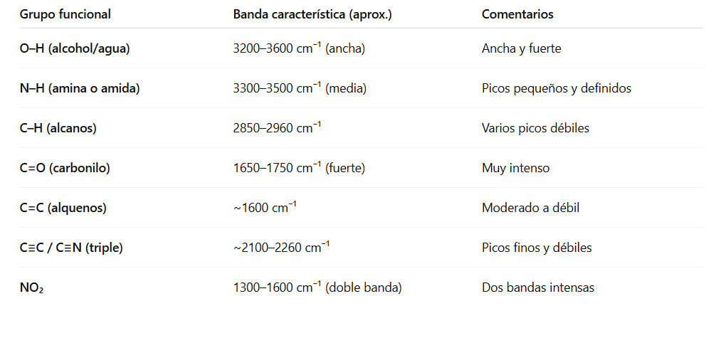En espectroscopía de infrarrojo (IR), la manera más sencilla de interpretar los espectros consiste en identificar los grupos funcionales presentes en una molécula a partir de las bandas de absorción características.