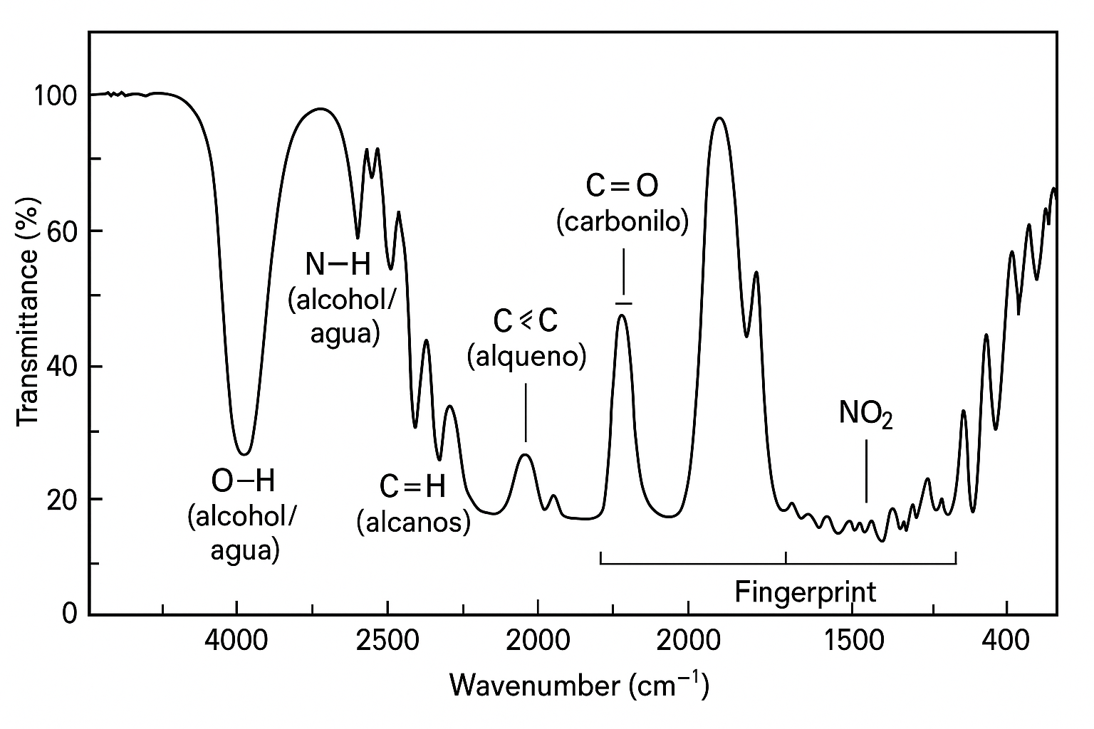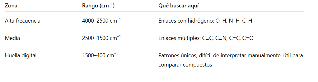Y por último identificar la huella digital, entre 1500 y 400 cm⁻¹ hay un patrón muy complejo que es único para cada molécula que aunque es difícil de interpretar manualmente, se puede usar para comparar espectros conocidos (por ejemplo, con una base de datos).